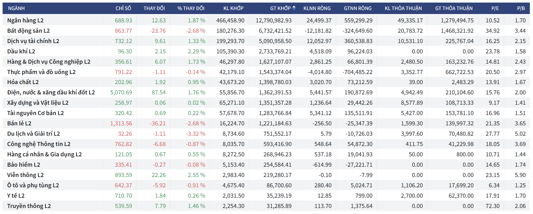 Kết luận sơ bộ: Thị trường đang trải qua giai đoạn tái cơ cấu danh mục mạnh mẽ khi dòng tiền ngoại và nội cùng đồng thuận ưu tiên nhóm Ngân hàng để giữ nhịp, nhưng áp lực bán ròng và chốt lời tại các ngành đã tăng nóng trước đó như Bất động sản đang gây áp lực điều chỉnh lên toàn hệ thống.