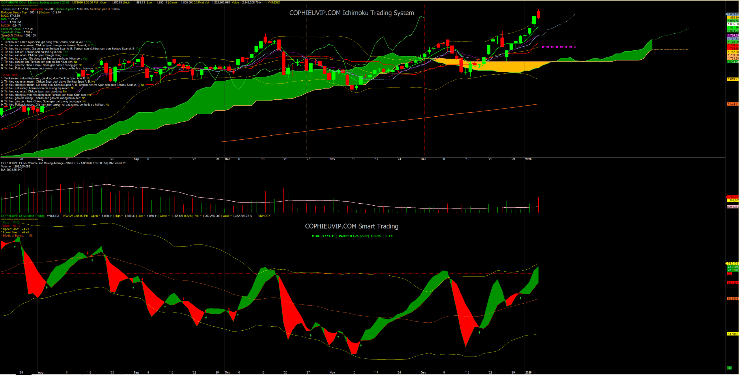- Hiện tại chưa xuất hiện tín hiệu phân kỳ âm rõ rệt giữa giá và chỉ báo Smart Trading. Sự đồng thuận này cho thấy nhịp giảm điểm trong phiên 08/01 thuần túy là nhịp điều chỉnh kỹ thuật để giải tỏa trạng thái quá mua chứ chưa phải dấu hiệu sụt gãy xu hướng chính.