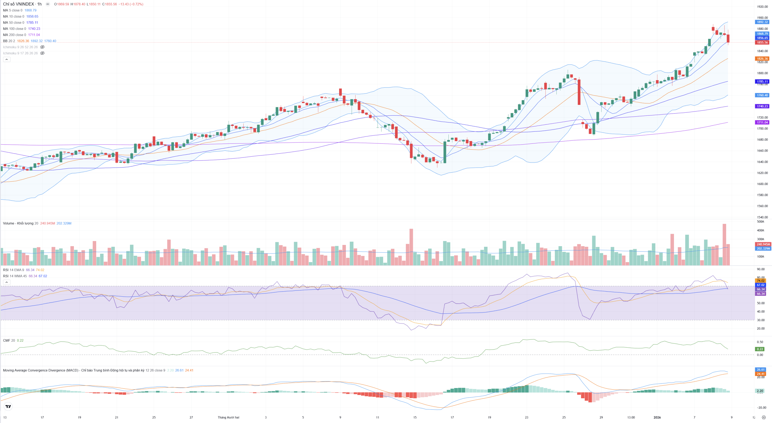 Kết luận sơ bộ: Diễn biến khung giờ (H1) phiên 08/01/2026 cho thấy một nhịp thoái lui kỹ thuật mạnh mẽ và lấp Gap hoàn toàn vào giờ giao dịch cuối cùng. Áp lực bán bùng nổ với thanh khoản lớn ở cuối phiên đã đẩy chỉ số xuyên thủng các đường hỗ trợ ngắn hạn (MA5, MA10), đưa RSI thoát khỏi vùng quá mua để hạ nhiệt. Tuy nhiên, với việc dòng tiền CMF vẫn giữ mức dương và giá vẫn nằm trên MA20 khung H1, đây hiện tại vẫn được xem là nhịp điều chỉnh cần thiết để tái cân bằng sau giai đoạn tăng nóng, trước khi tìm điểm tựa quanh vùng 1,825 – 1,830 điểm.