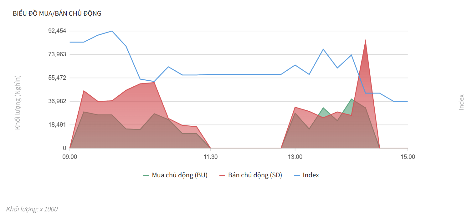 - Phe Mua chủ động (màu xanh) gần như không có sự phản kháng đáng kể, chỉ xuất hiện các nhịp mua mỏng và thưa thớt.
