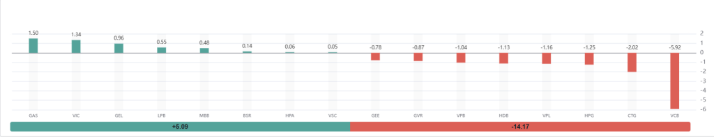 - Nhóm cổ phiếu gây áp lực giảm điểm lấy đi tổng cộng -14.17 điểm.