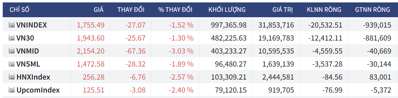 - VN-Index đóng cửa tại 1,755.49, giảm mạnh -27.07 điểm (-1.52%).