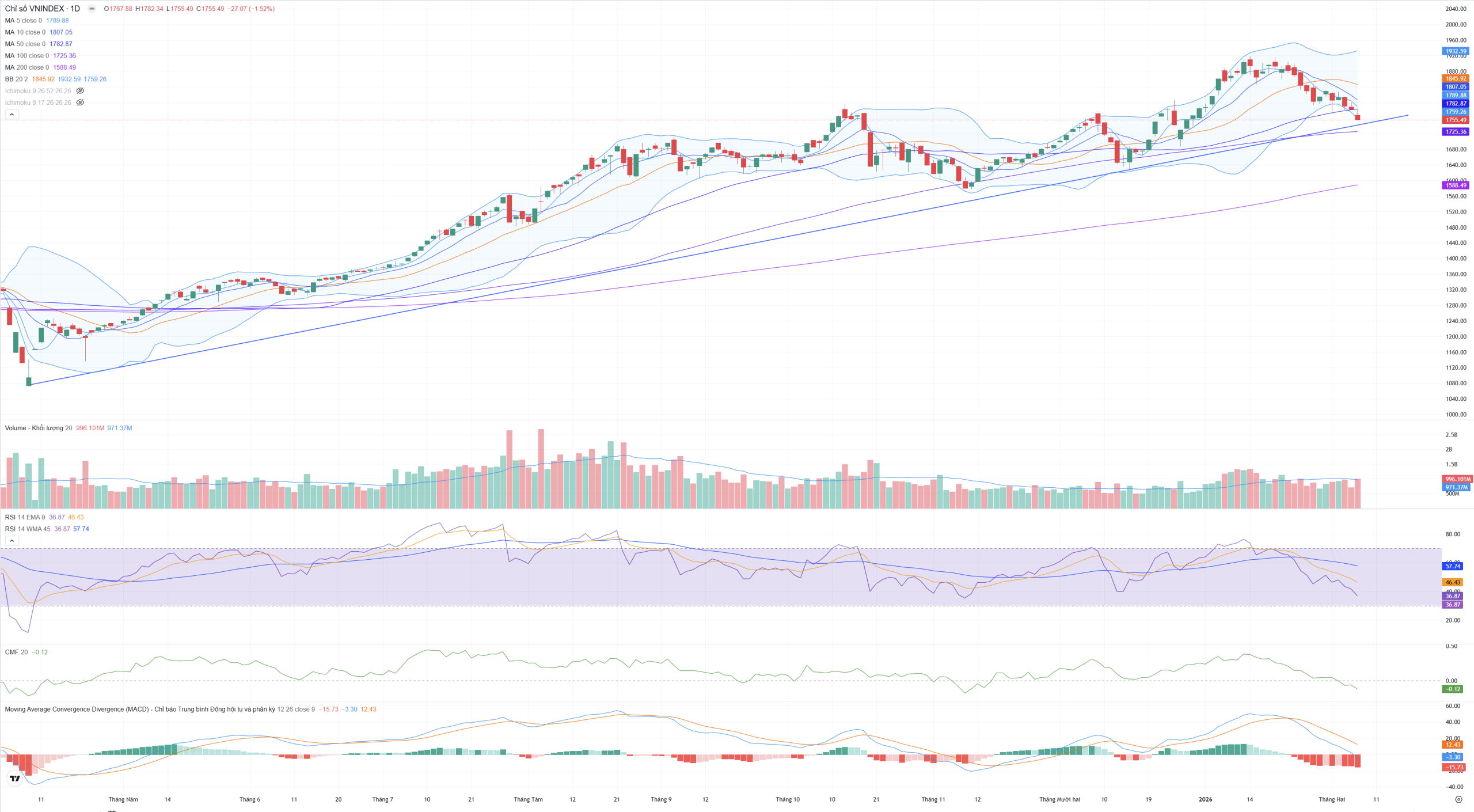 - Các đường ngắn hạn MA5 (1,789.88) và MA10 (1,807.05) đang dốc xuống rất gắt, tạo thành các rào cản kháng cự mạnh phía trên. Chỉ số hiện đang bị kẹp giữa MA50 (kháng cự) và hướng về MA100 (1,725.36) để tìm điểm tựa mới.
