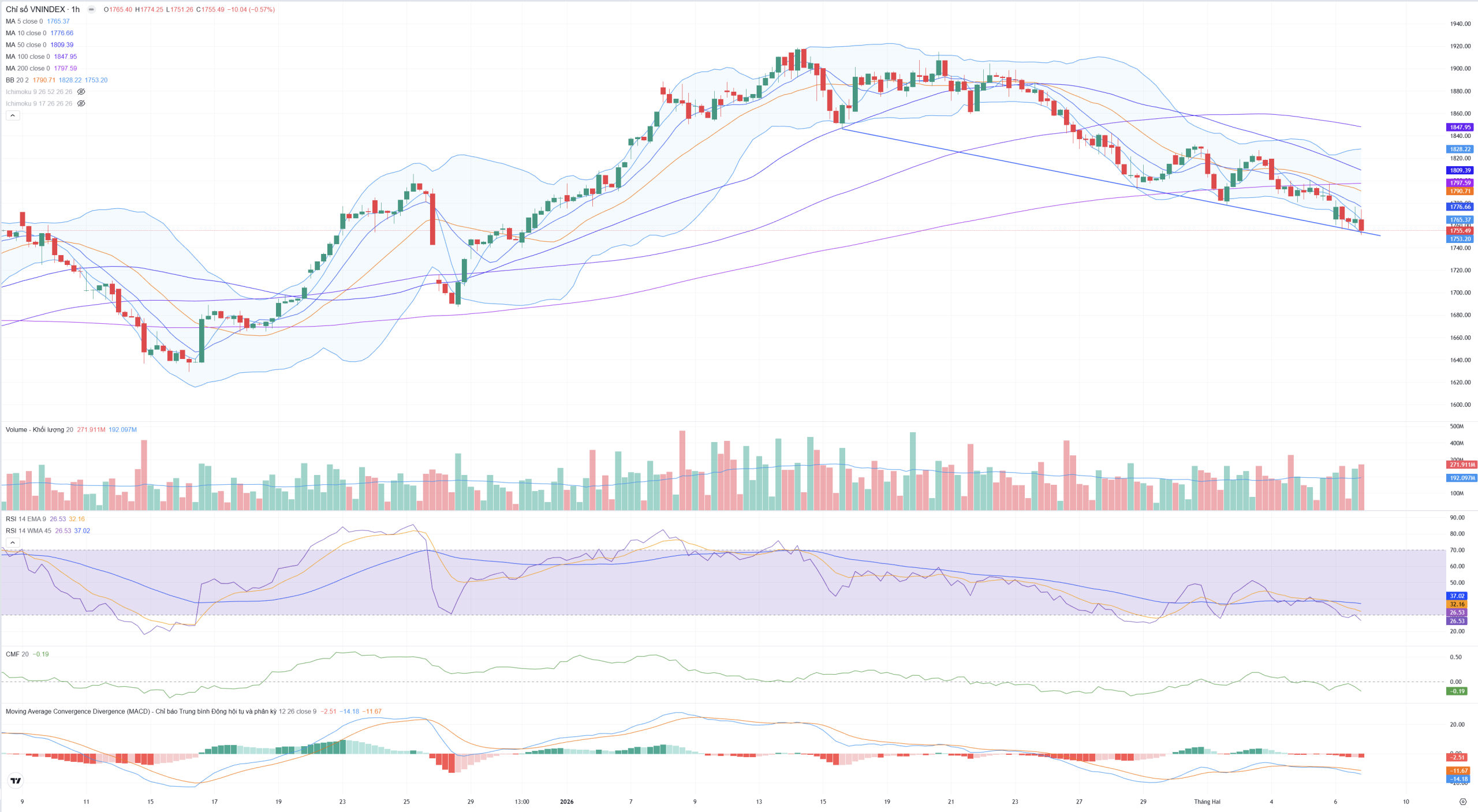- Chỉ số VN-Index khung H1 nằm hoàn toàn dưới các đường trung bình động quan trọng: MA5 (1,765.37), MA10 (1,776.66), MA20 (1,790.71) và đặc biệt là đánh mất đường MA200 (1,797.59).