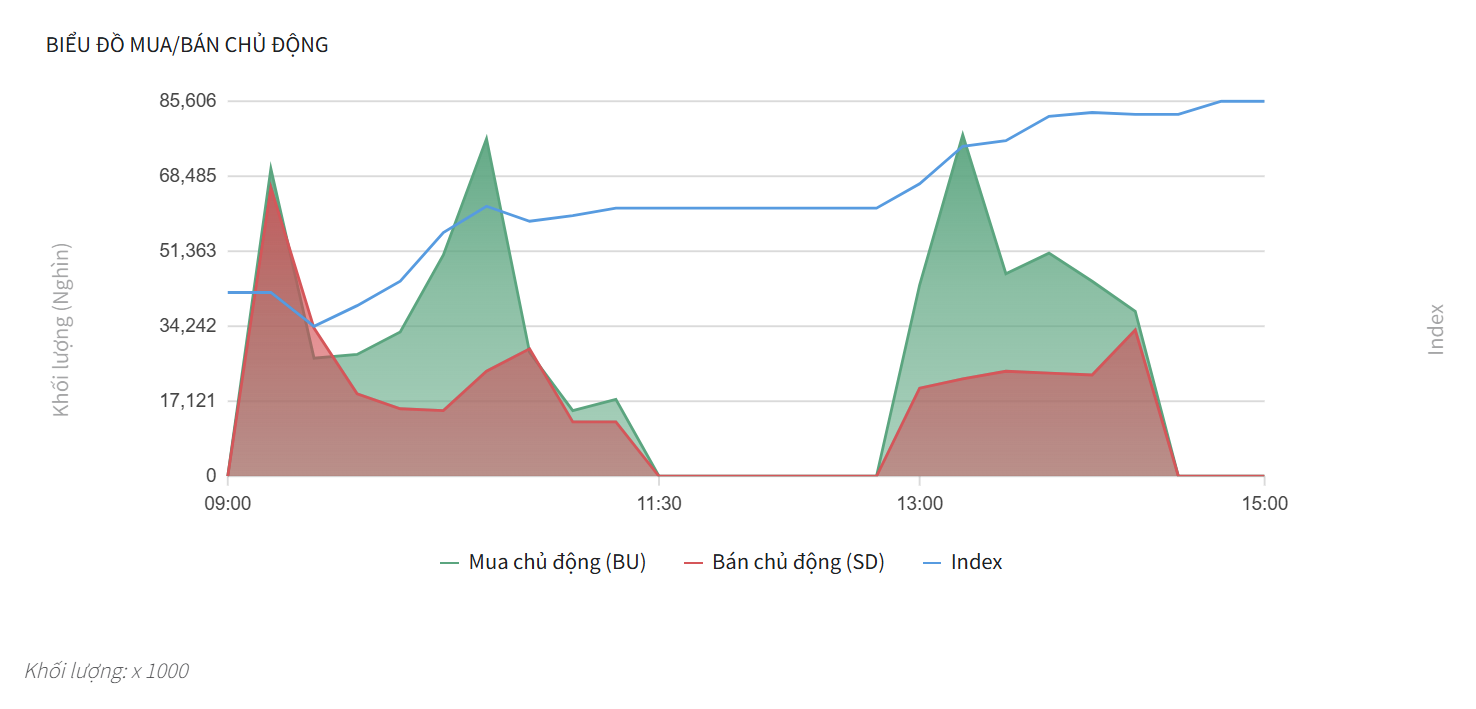 - Giai đoạn đầu phiên chiều (13:00 – 14:00): Đây là thời điểm hưng phấn nhất trong ngày. Ngay khi mở cửa phiên chiều, lực Mua chủ động ghi nhận một cú “nhảy vọt” cực đại, chạm ngưỡng cao nhất trên biểu đồ (sát mốc 85,606 đơn vị). Lực Bán chủ động dù có tăng nhưng hoàn toàn bị áp đảo bởi dòng tiền mua lên dứt khoát. Nhịp đẩy này đã đưa chỉ số Index vượt qua mọi ngưỡng cản và duy trì đà tăng dốc đứng.