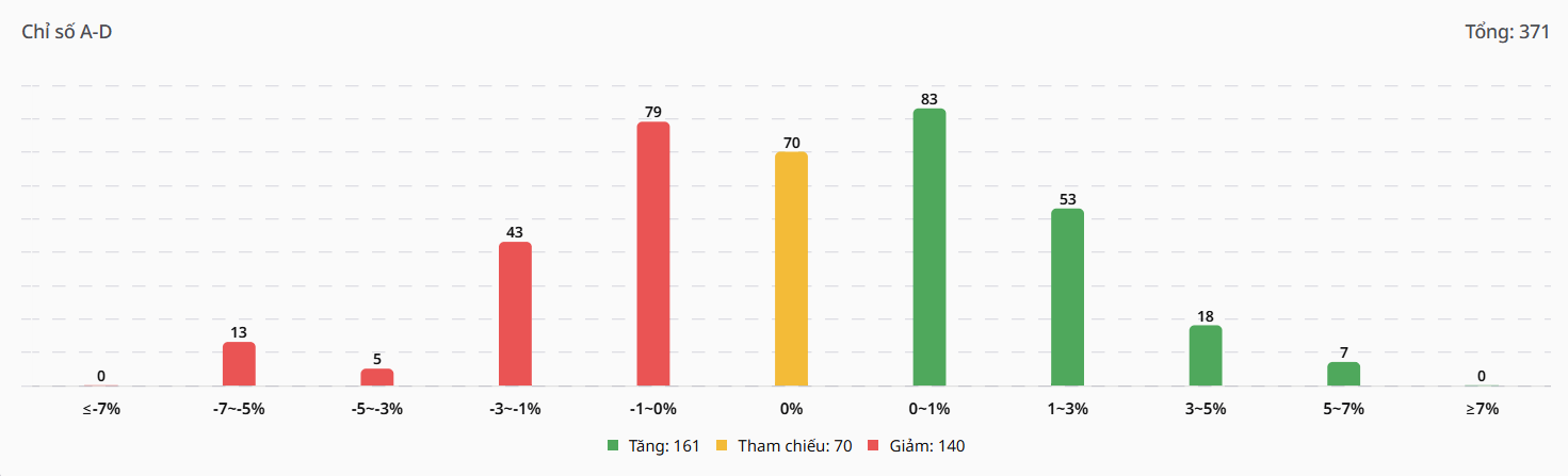 - Phân bổ chi tiết nhóm cổ phiếu Tăng giá: Lực cầu không chỉ lan tỏa rộng mà còn có cường độ rất mạnh. Nhóm tăng từ 1% đến 3% chiếm tỷ trọng lớn nhất với 106 mã, theo sát là nhóm tăng từ 3% đến 5% với 96 mã. Đặc biệt, có tới 59 mã ghi nhận mức tăng trưởng mạnh trong biên độ từ 5% đến 7% và 1 mã tăng trên 7%, cho thấy dòng tiền đẩy giá quyết liệt trên diện rộng. Nhóm tăng nhẹ dưới 1% ghi nhận 60 mã.