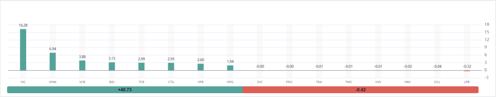 - Tổng điểm đóng góp từ nhóm tích cực: Đạt mức kỷ lục +40.73 điểm, cho thấy sự đồng thuận cực lớn của các cổ phiếu vốn hóa lớn.