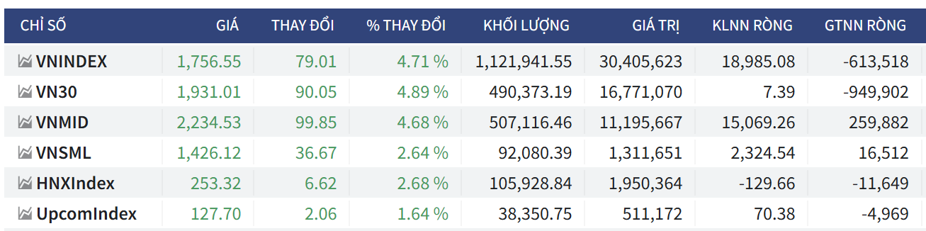 - Chốt phiên, VN-Index tăng 79,01 điểm (+4,71%) lên 1.756,55 điểm; HNX-Index tăng 6,62 điểm (+2,68%) lên 253,32 điểm; UPCoM-Index tăng 2,06 điểm (+1,64%) lên 127,7 điểm