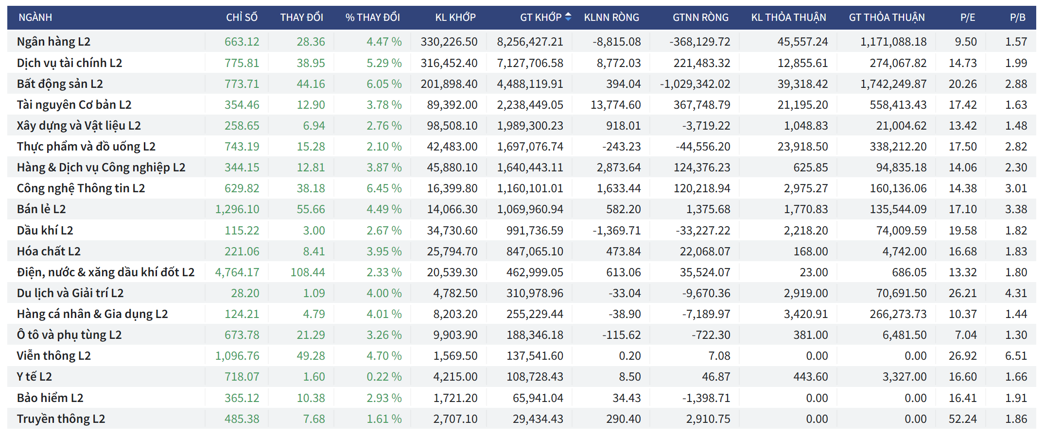 - Tương quan giữa các nhóm: Tỷ lệ mã tăng so với mã giảm là xấp xỉ 12:1. Điều này phản ánh một phiên giao dịch có sự đồng thuận cực cao giữa tất cả các nhóm vốn hóa, từ trụ cột đến các mã tầm trung và nhỏ.