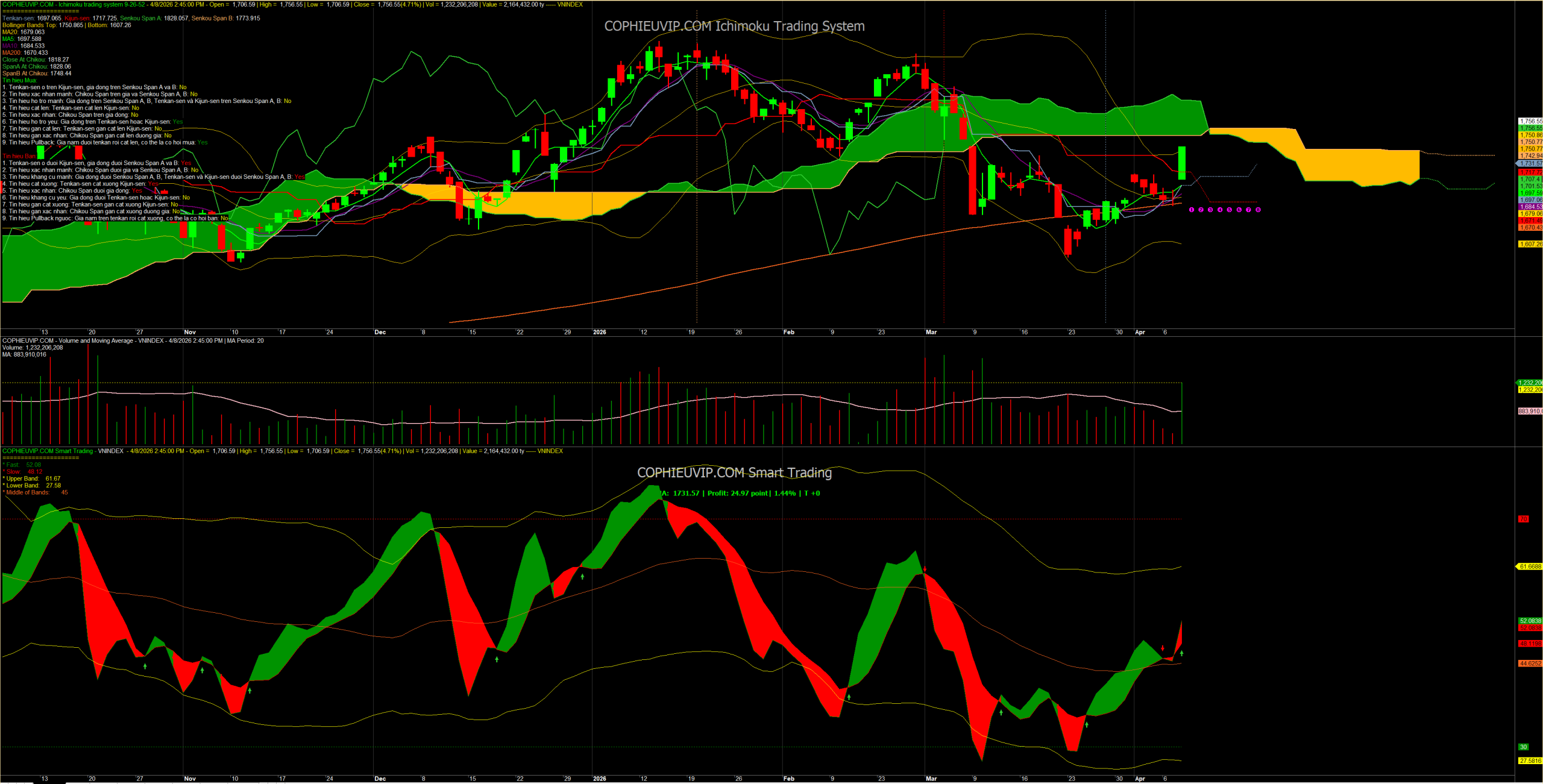 - Hỗ trợ: Vùng 1.706 (Gap Up hôm nay) và vùng 1.670 – 1.680 (Hội tụ MA20 và MA200).
