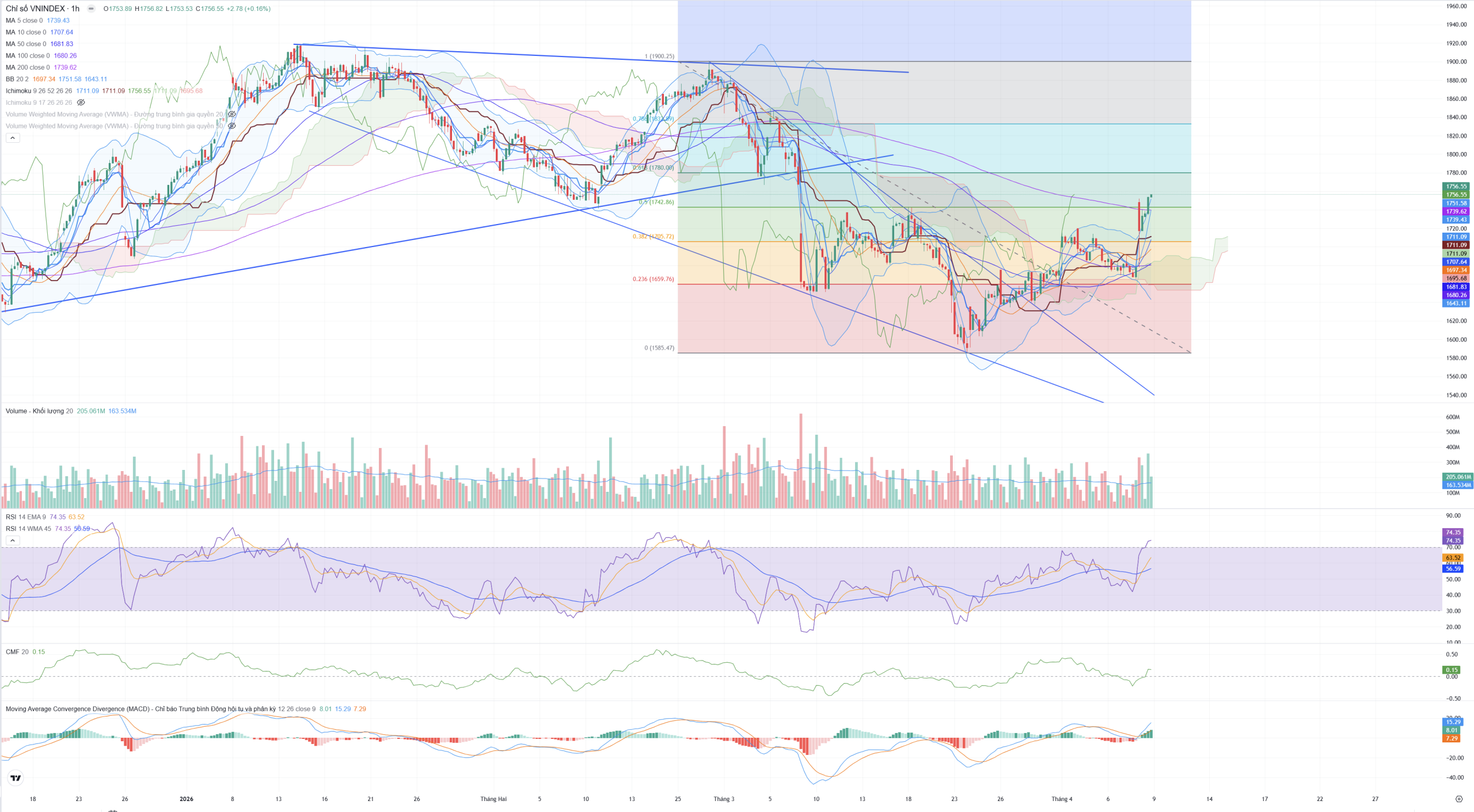 Khung đồ thị H1 của VN-Index sau phiên giao dịch ngày 08/04/2026 thể hiện sức mạnh áp đảo của phe mua. Việc chỉ số vượt qua MA200 khung giờ và đẩy CMF lên mức dương 0,15 là những minh chứng rõ nét cho sự chuyển biến từ trạng thái phòng thủ sang tấn công của dòng tiền. Mặc dù các chỉ báo động lượng (RSI) và dải Bollinger Bands đang cảnh báo trạng thái quá mua ngắn hạn, nhưng với xung lực từ tin tức nâng hạng và vĩ mô thế giới, thị trường nhiều khả năng sẽ duy trì sắc xanh hoặc điều chỉnh nhẹ mang tính chất tích lũy để củng cố nền giá mới trên mốc 1.740 điểm.