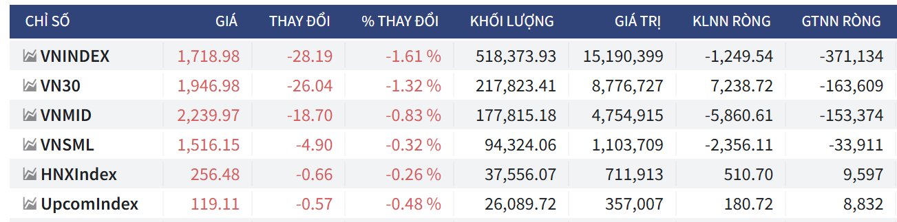 - Chốt phiên, VN-Index giảm 28,19 điểm (-1,61%), xuống 1.718,98 điểm; HNX-Index giảm 0,66 điểm (-0,26%), xuống 256,48 điểm; UpCoM-Index giảm 0,57 điểm (-0,48%), xuống 119,11 điểm
