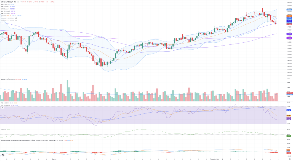 - Cấu trúc giá: Chỉ số đã tạo Đỉnh sau thấp hơn (H: 1,748.82 thấp hơn H: 1,758.41). Đáy (L: 1,714.44) thấp hơn đáy gần nhất (L: 1,725.23). Cấu trúc đã chuyển sang xu hướng giảm ngắn hạn rõ ràng.