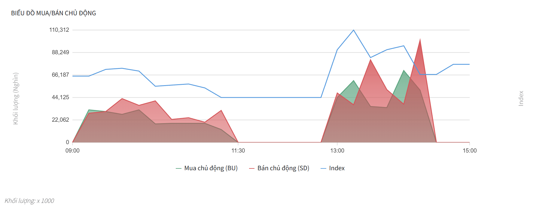 - Diễn biến cuối phiên chiều (13:45 – 14:30): Áp lực bán chủ động (vùng màu đỏ) bất ngờ tăng mạnh và áp đảo hoàn toàn lực mua. Đỉnh điểm của phe bán xuất hiện vào khoảng sau 14:15, khiến đường chỉ số Index rơi sâu từ đỉnh phiên chiều.