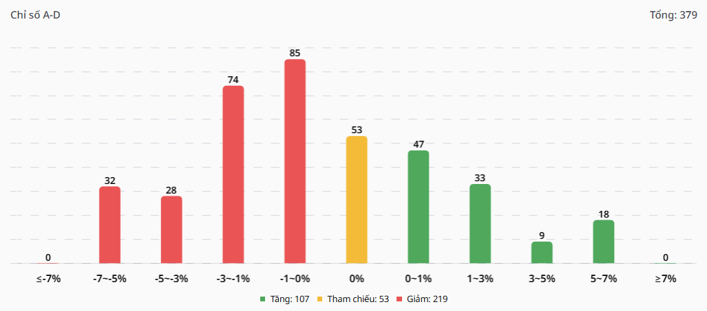 Mặc dù chỉ số VN-Index đóng cửa tăng +12,34 điểm, nhưng độ rộng thị trường lại phản ánh một trạng thái tiêu cực khi số mã giảm (219 mã) gấp hơn 2 lần số mã tăng (107 mã). Đặc biệt, có tới 134 mã (chiếm hơn 35% thị trường) giảm trên 1%, cho thấy hiện tượng “Xanh vỏ đỏ lòng” đang diễn ra cực kỳ nghiêm trọng, chỉ số tăng điểm chủ yếu nhờ vào lực kéo của một vài mã vốn hóa lớn trong khi phần lớn các cổ phiếu khác đang chịu áp lực điều chỉnh sâu.