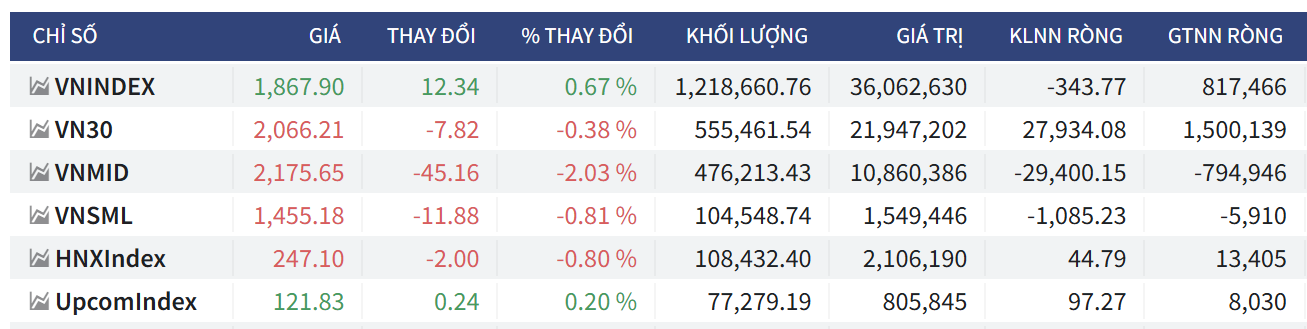 - Chỉ số VN-Index: Đóng cửa tại mức 1.867,90 điểm, tăng +12,34 điểm (+0,67%). Khối lượng giao dịch đạt 1.218.660,76 nghìn cổ phiếu với giá trị giao dịch đạt 36.062.630 triệu VNĐ. Về dòng tiền ngoại, nhóm này bán ròng về khối lượng (-343,77 nghìn cổ phiếu) nhưng lại mua ròng về giá trị (+817.466 triệu VNĐ).