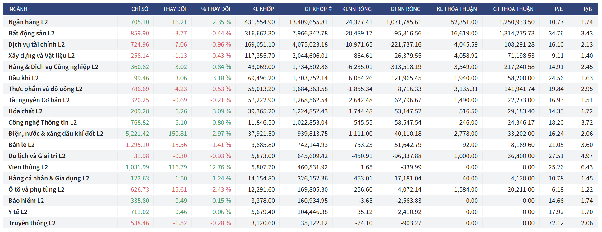 So với phiên trước, dòng tiền đã chuyển dịch mạnh mẽ và tập trung cao độ vào nhóm Ngân hàng và các ngành “trụ” vốn nhà nước như Dầu khí, Điện lực, tạo nên một phiên tăng điểm mang tính dẫn dắt của nhóm vốn hóa lớn bất chấp áp lực bán vẫn đang lan tỏa ở các nhóm ngành phụ trợ.