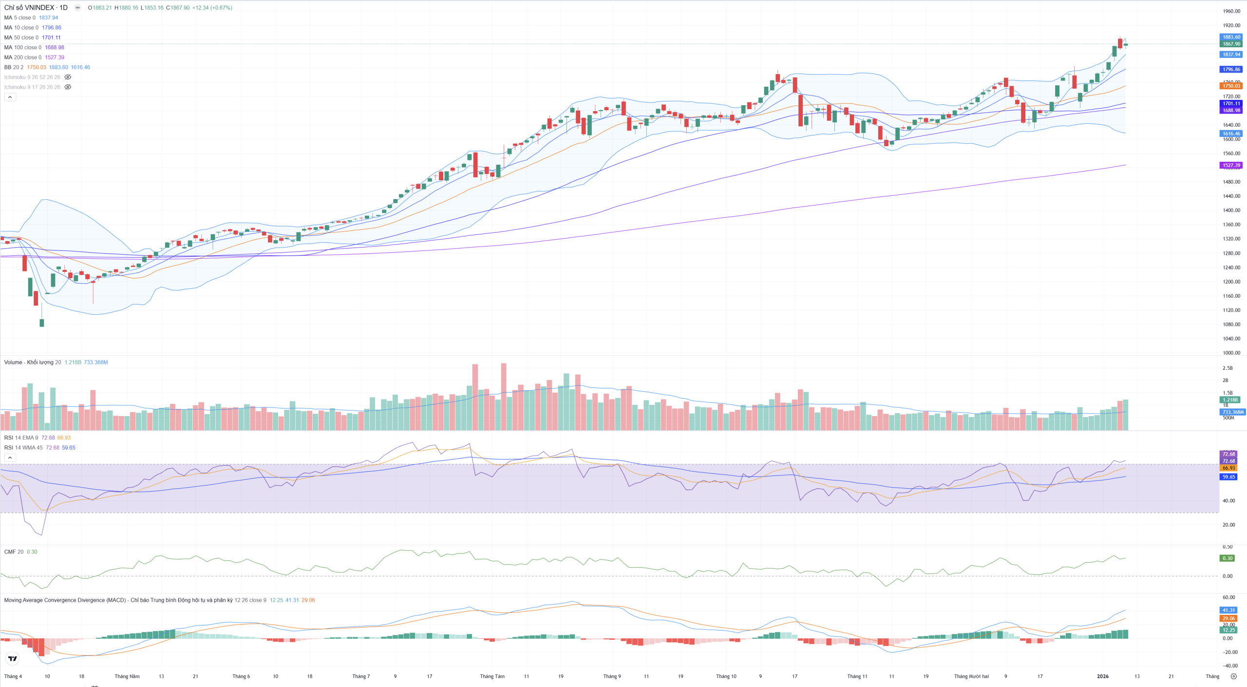 Kết luận sơ bộ: Phiên 09/01/2026 là một nhịp hồi phục quan trọng giúp VN-Index lấy lại sắc xanh sau phiên “xả hàng” kỷ lục ngày 08/01. Mặc dù thị trường vẫn đang trong trạng thái quá mua (RSI > 72) và thanh khoản cực lớn cho thấy sự giằng co quyết liệt, nhưng các chỉ báo dòng tiền (CMF) và xung lực (MACD) vẫn đang ủng hộ phe Mua. Chỉ số dự kiến sẽ tiếp tục tích lũy và kiểm định vùng đỉnh 1,880 – 1,888 điểm trước khi xác lập xu hướng rõ ràng hơn cho tuần kế tiếp.