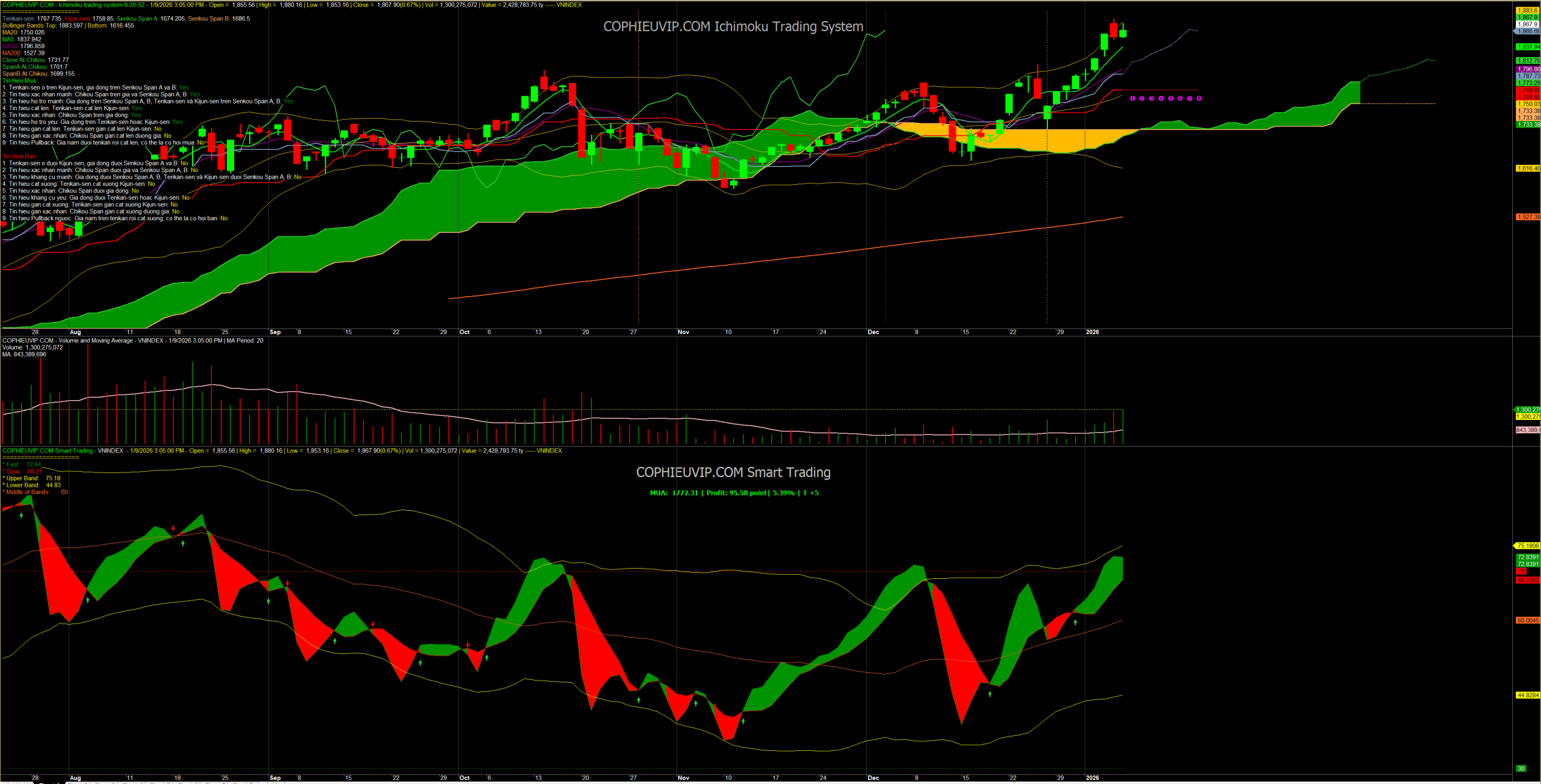 Kết luận sơ bộ: Chỉ báo Smart Trading khẳng định xu hướng tăng của VN-Index vẫn được bảo toàn với mức lợi nhuận ấn tượng +5.39% sau 5 phiên. Tuy nhiên, việc chỉ báo nằm sâu trong vùng quá mua cùng sự xuất hiện của tín hiệu phân kỳ âm nhẹ giữa giá và động lượng Fast cảnh báo thị trường đang tiến gần đến vùng rủi ro đảo chiều ngắn hạn. Nhà đầu tư nên ưu tiên quản trị rủi ro, hạn chế mua đuổi khi tín hiệu Fast đang ở sát biên trên (Upper Band) và theo dõi sát sao sự đồng thuận của khối lượng để xác nhận độ tin cậy của đà tăng.