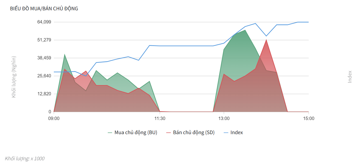 - Lực bán chủ động (SD – màu đỏ) trong phiên sáng duy trì ở mức thấp và bị phe mua áp đảo hoàn toàn trong phần lớn thời gian. Nhịp bán đáng kể nhất chỉ xuất hiện vào khoảng 09:45 nhưng ngay sau đó bị lực mua hấp thụ hết, đẩy chỉ số Index duy trì đà tăng tiến về giờ nghỉ trưa.