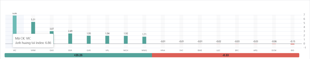 - Nhóm cổ phiếu đóng góp tăng điểm áp đảo tuyệt đối khi giúp chỉ số cộng thêm tới +25.25 điểm (chỉ tính riêng top các mã dẫn dắt).