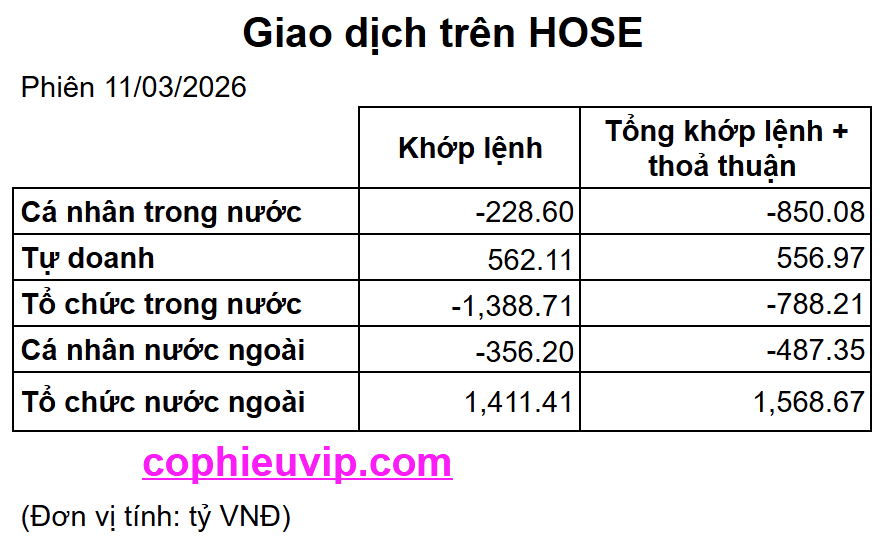Kết luận sơ bộ: Phiên giao dịch ngày 11/03/2026 ghi nhận một sự bùng nổ theo đà (FTD) cực kỳ ấn tượng của thị trường chứng khoán Việt Nam. Điểm nhấn lớn nhất là sự trở lại mạnh mẽ của nhóm Midcap với mức tăng hơn 4,4% và động thái mua ròng nghìn tỷ phiên thứ hai liên tiếp của khối ngoại trên sàn HOSE. Dòng tiền không chỉ tập trung ở nhóm trụ mà đã lan tỏa đều khắp các nhóm vốn hóa, xác nhận tâm lý nhà đầu tư đã hoàn toàn hồi phục sau cú sốc địa chính trị.