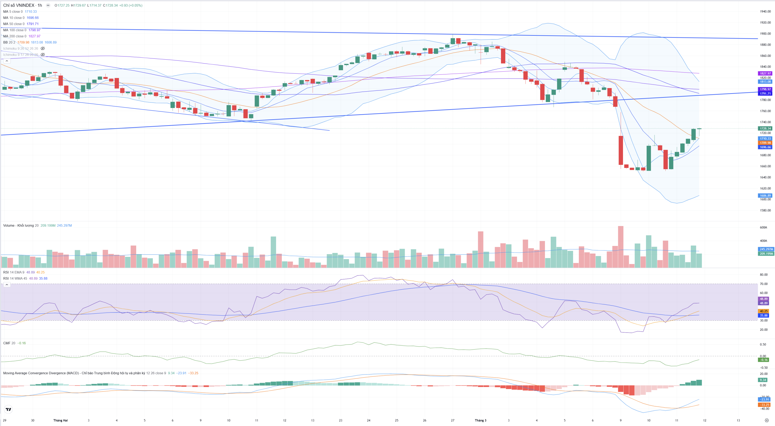 - Chỉ số đã bứt phá hoàn toàn lên trên các đường ngắn hạn: MA5 (1.710,33), MA10 (1.696,66) và MA20 (1.709,98).