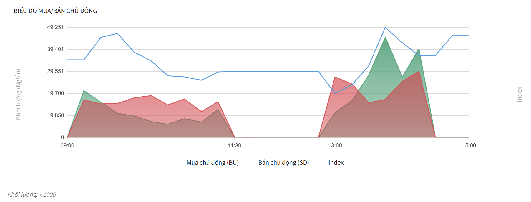 - Lực mua mạnh mẽ này đã đẩy chỉ số Index (đường xanh dương) tăng vọt lên mức cao nhất trong ngày.