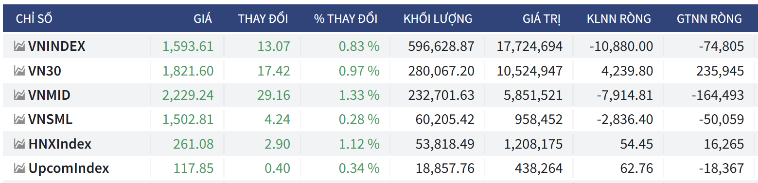 - Đóng cửa tại 1,593.61 điểm, tăng +13.07 điểm (+0.83%).