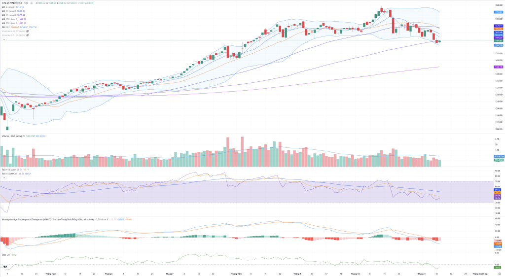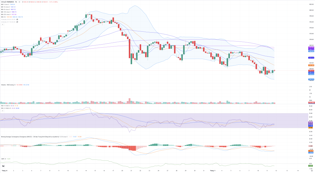 - Tín hiệu: Xu hướng giảm ngắn và trung hạn vẫn được duy trì. MA100 (1,594.29) đang là kháng cự gần nhất cần vượt qua để xác nhận sự ổn định.