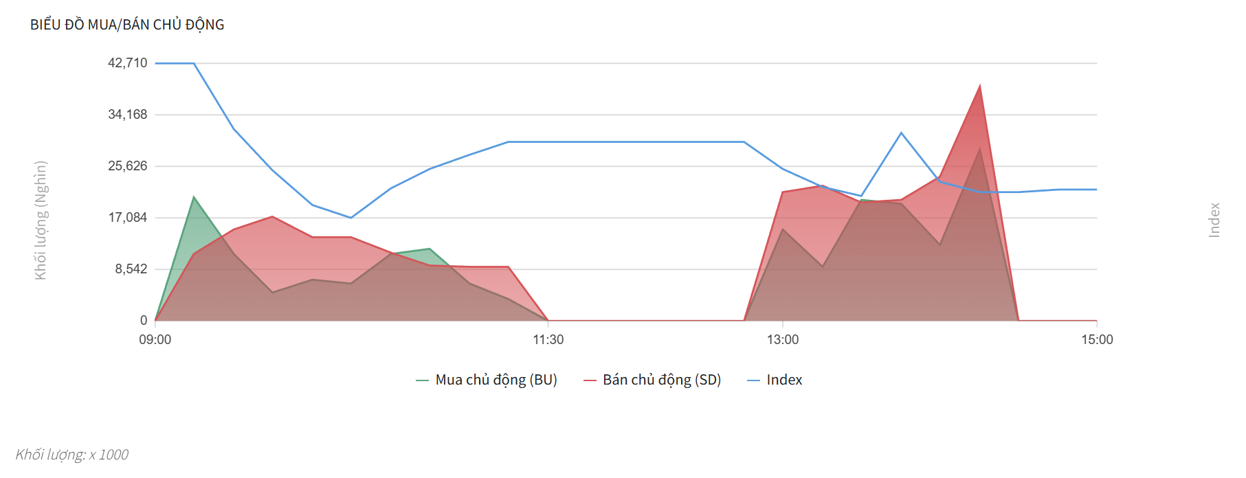 - Lực mua chủ động (BU) cũng có một nhịp tăng nhẹ vào giữa phiên chiều nhưng nhanh chóng bị lực bán áp đảo.