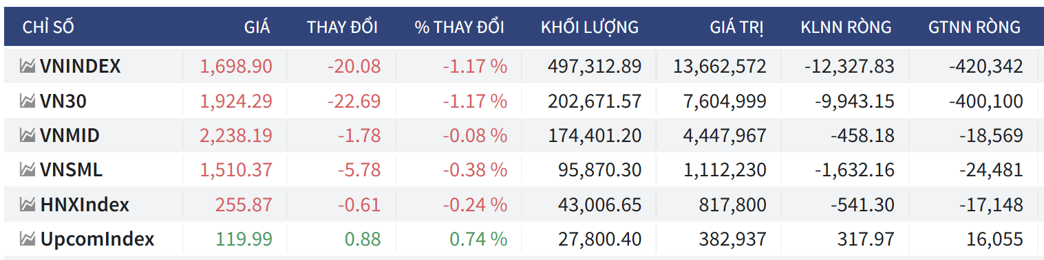 - Chốt phiên, VN-Index giảm 20,08 điểm (-1,17%), xuống 1.698,9 điểm; HNX-Index giảm 0,61 điểm (-0,24%), xuống 255,87 điểm; UpCoM-Index tăng 1,05 điểm (+0,88%), lên 120,16 điểm