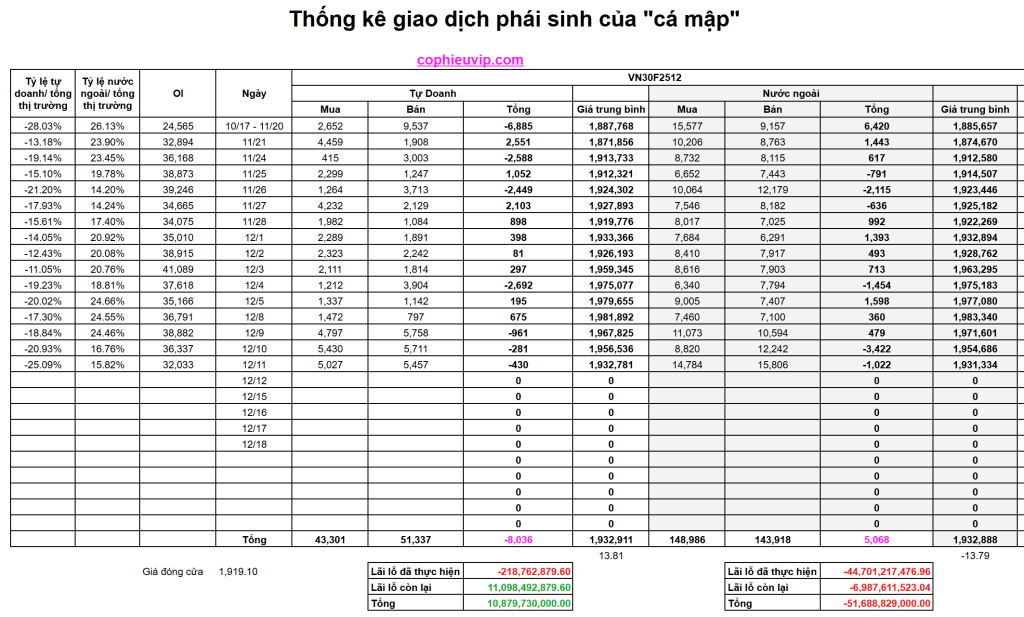 - Tổng Bán ròng Phiên: Tổng cộng, hai nhóm này bán ròng -1,452 HĐ (Short) trong phiên 11/12.