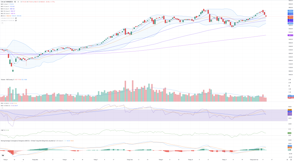 - Việc giá nằm trên MA50 (1,681.84) vẫn giữ xu hướng tích cực cho trung hạn, nhưng đang chịu áp lực lớn.