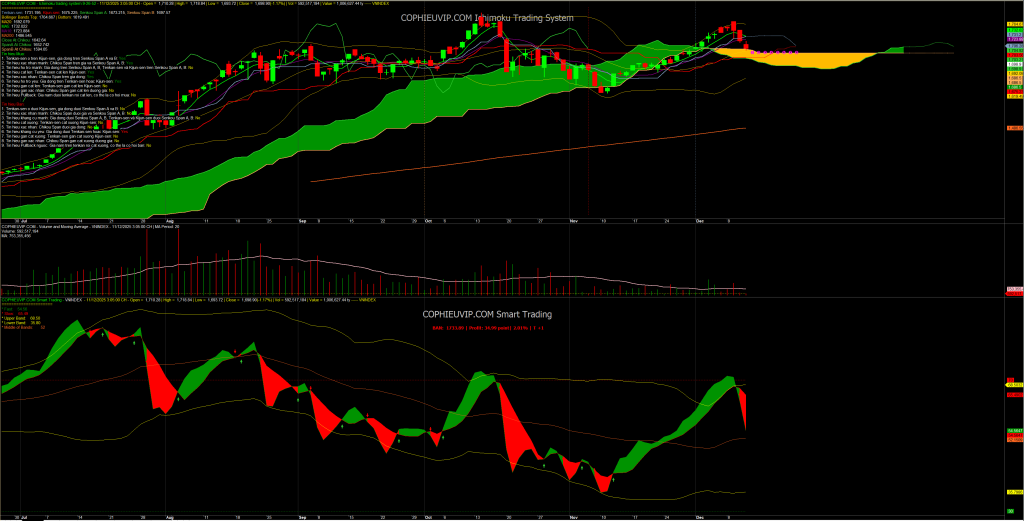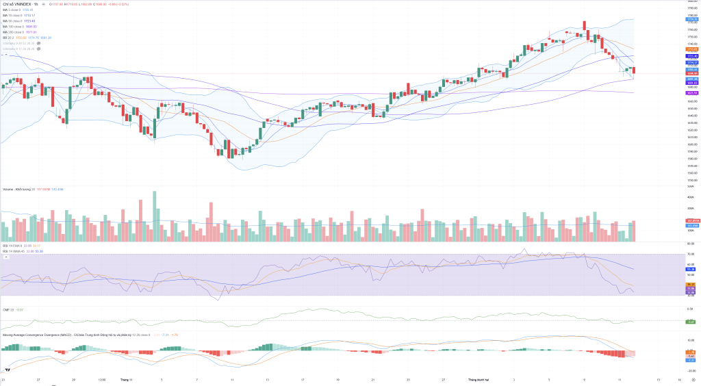 Diễn biến Giá (OHLC): O: 1,710.28 | H: 1,718.84 | L: 1,693.72 | C: 1,698.90. Phiên 11/12 tạo ra một nến giảm mạnh (-1.17%) và là phiên giảm điểm thứ ba liên tiếp của VN-Index. Giá đóng cửa nằm ngay trên mức thấp nhất phiên và đóng cửa dưới ngưỡng tâm lý 1,700 điểm.