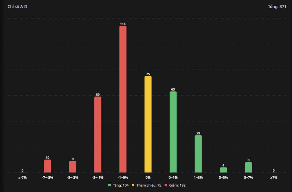 Phân hóa: Đà giảm sâu (-1.17%) chủ yếu đến từ các cổ phiếu vốn hóa lớn, trong khi phần lớn các cổ phiếu khác chỉ giảm nhẹ (dưới -1%) hoặc giữ được sắc xanh, xác nhận sự phân hóa rõ ràng.