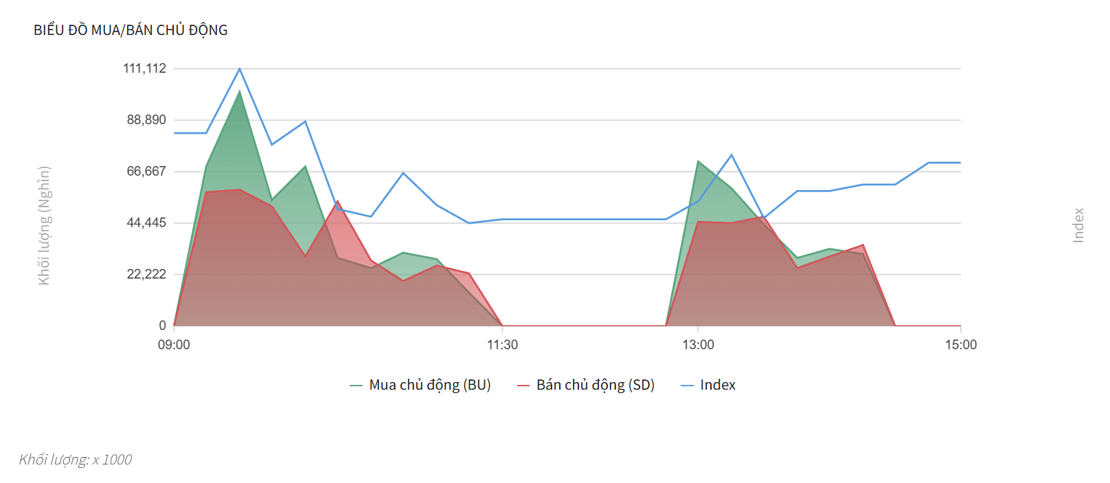 - Diễn biến đầu phiên sáng (09:00 – 10:00): Thị trường mở cửa với xung lực mua rất mạnh. Vùng màu xanh (lực mua chủ động) mở rộng và bùng nổ, đẩy đường chỉ số Index đi lên nhanh chóng và đạt đỉnh cao nhất vào khoảng 10:00.
