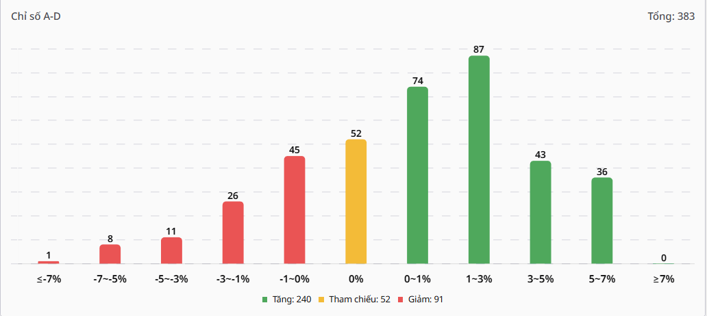 - Độ rộng của dải màu xanh đang mở rộng dần, phản ánh lực mua vẫn đang gia tăng và dòng tiền dẫn dắt đang kiểm soát tốt thế trận.