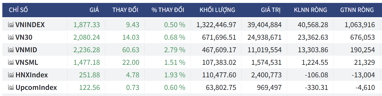 - Chỉ số VN-Index: Đóng cửa tại mức 1,877.33 điểm, tăng +9.43 điểm (+0.50%). Khối lượng giao dịch đạt 1,322,446.97 nghìn cổ phiếu với giá trị giao dịch đạt 39,404,884.0 triệu VNĐ. Khối ngoại mua ròng mạnh cả về khối lượng (+40,568.28 nghìn cổ phiếu) và giá trị (+1,063,916.0 triệu VNĐ).