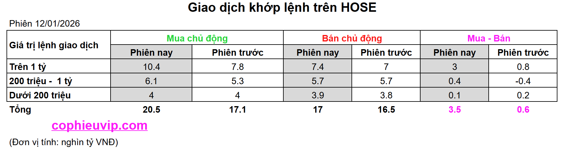 Kết luận sơ bộ: Phiên giao dịch ngày 12/01/2026 ghi nhận một sự bùng nổ về chất lượng dòng tiền khi giá trị mua ròng chủ động tăng vọt lên mức +3.5 nghìn tỷ VNĐ. Động lực chính đến từ các lệnh giao dịch quy mô lớn (trên 1 tỷ VNĐ), cho thấy sự đồng thuận và quyết tâm đẩy giá của các dòng tiền dẫn dắt thị trường. Việc tất cả các phân khúc lệnh từ nhỏ đến lớn đều ở trạng thái mua ròng là tín hiệu kỹ thuật rất tích cực, củng cố đà tăng điểm bền vững cho chỉ số VN-Index trong ngắn hạn.