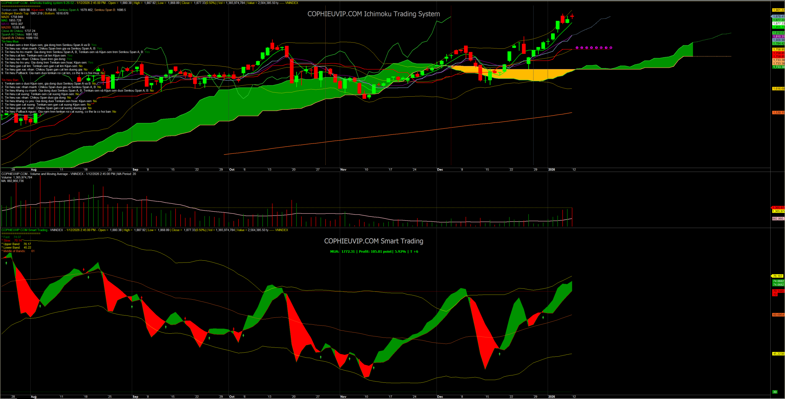 Kết luận sơ bộ: Chỉ báo Smart Trading phiên 12/01/2026 khẳng định thị trường vẫn đang trong một xu hướng tăng giá mạnh mẽ và lành mạnh với lợi nhuận lũy kế của VN-Index đã đạt gần 6%. Mặc dù đã tiến vào vùng quá mua, nhưng với việc chưa xuất hiện phân kỳ âm và các đường tín hiệu vẫn đang hướng lên bám biên trên, đà tăng của chỉ số VN-Index dự kiến sẽ còn tiếp diễn để kiểm định các ngưỡng kháng cự cao hơn.