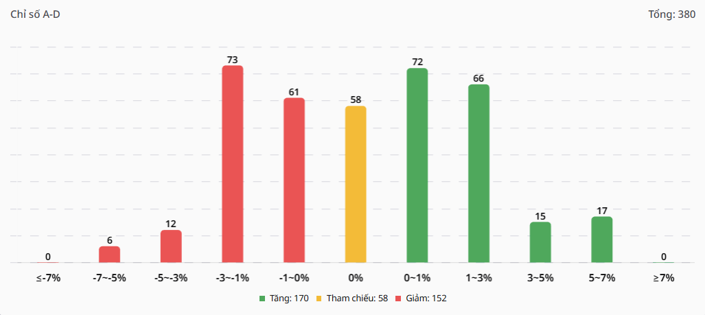 - Thị trường ghi nhận sự áp đảo của sắc xanh với 170 mã tăng, 58 mã tham chiếu và 152 mã giảm trên tổng số 380 mã được thống kê.