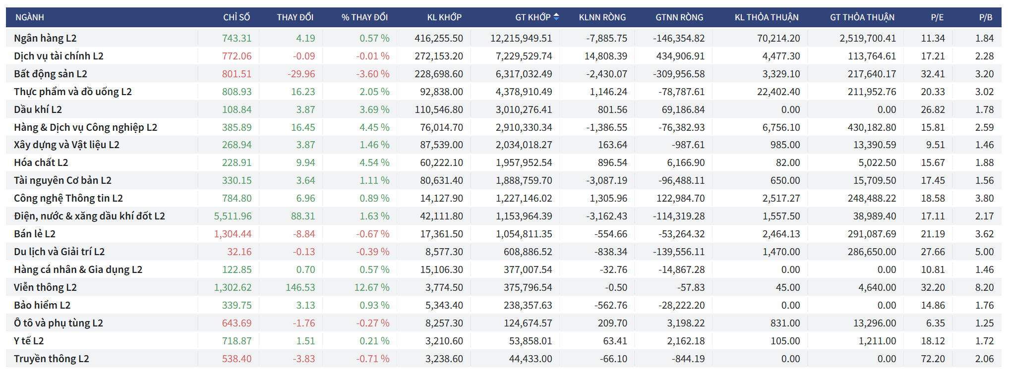 - Ngành Ngân hàng L2: Chỉ số đạt 743.31, tăng +4.19 (+0.57%); giá trị khớp lệnh đạt 12,215,949.51 triệu VNĐ; khối ngoại bán ròng khớp lệnh -146,354.82 triệu VNĐ nhưng mua ròng thỏa thuận +2,519,700.41 triệu VNĐ.