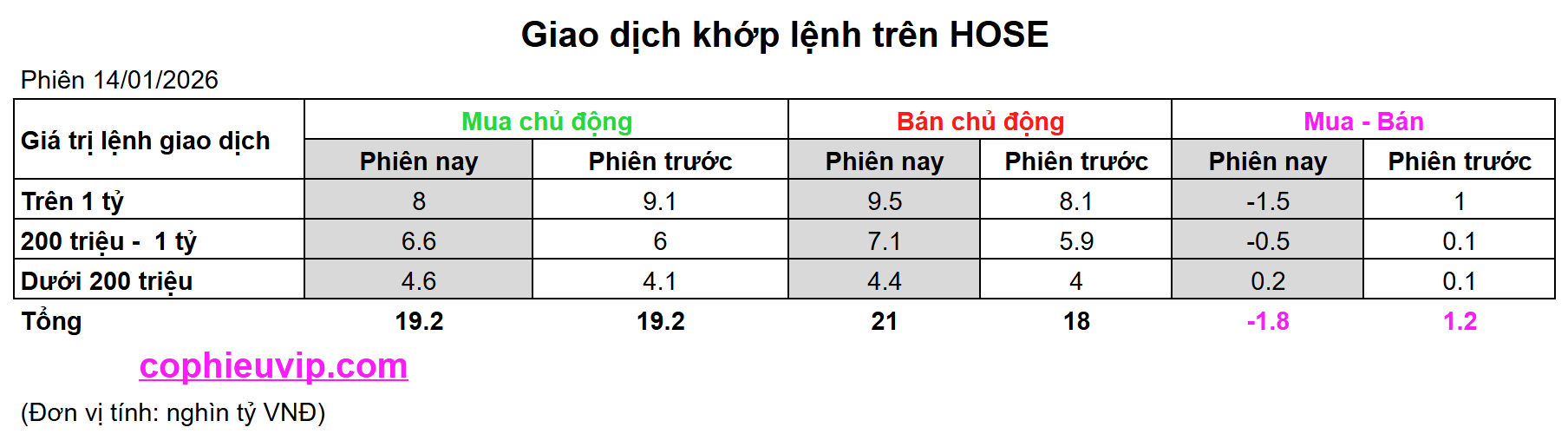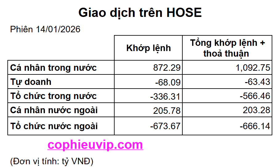 Kết luận sơ bộ: Phiên giao dịch ngày 14/01/2026 là một phiên điều chỉnh kỹ thuật của VN-Index sau khi chạm đến ngưỡng quá mua, khiến chỉ số tạm thời đánh mất mốc 1,900 điểm. Điểm đáng lưu ý là sự sụt giảm mạnh tập trung ở nhóm vốn hóa lớn (VN30) dưới tác động bán ròng của khối ngoại, trong khi dòng tiền nội vẫn nỗ lực xoay vòng sang nhóm Smallcap và sàn UPCoM để tìm kiếm lợi nhuận. Thanh khoản kỷ lục hơn 42 nghìn tỷ VNĐ cho thấy sự thay máu dòng tiền đang diễn ra rất quyết liệt trước thềm ngày đáo hạn phái sinh.
