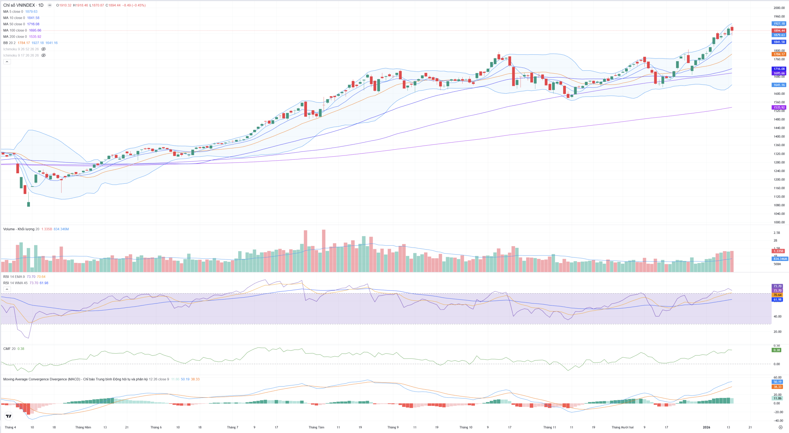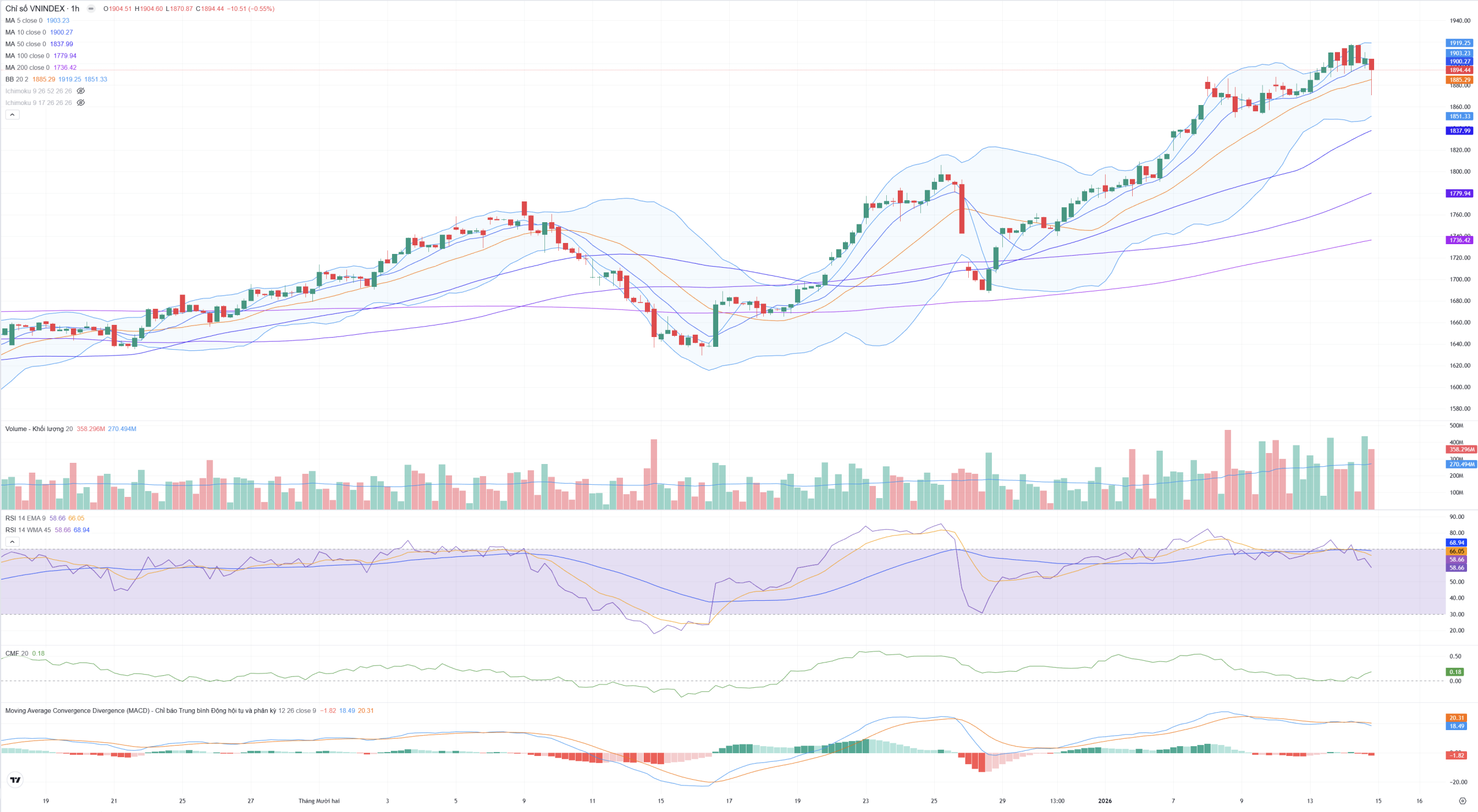 Kết luận sơ bộ: Tổng hòa các chỉ báo cho thấy phiên 14/01 là một phiên “Thanh lọc và Hấp thụ”. Mặc dù VN-Index giảm điểm và mất mốc 1,900, nhưng các chỉ báo dòng tiền (CMF) và xu hướng (MA, MACD) vẫn giữ vững trạng thái tích cực. Lực cầu bắt đáy dồi dào tại vùng 1,870 (thể hiện qua bóng nến dưới và volume lớn) là điểm tựa vững chắc, cho thấy đây chỉ là nhịp điều chỉnh kỹ thuật để thị trường hạ nhiệt sau giai đoạn tăng nóng.