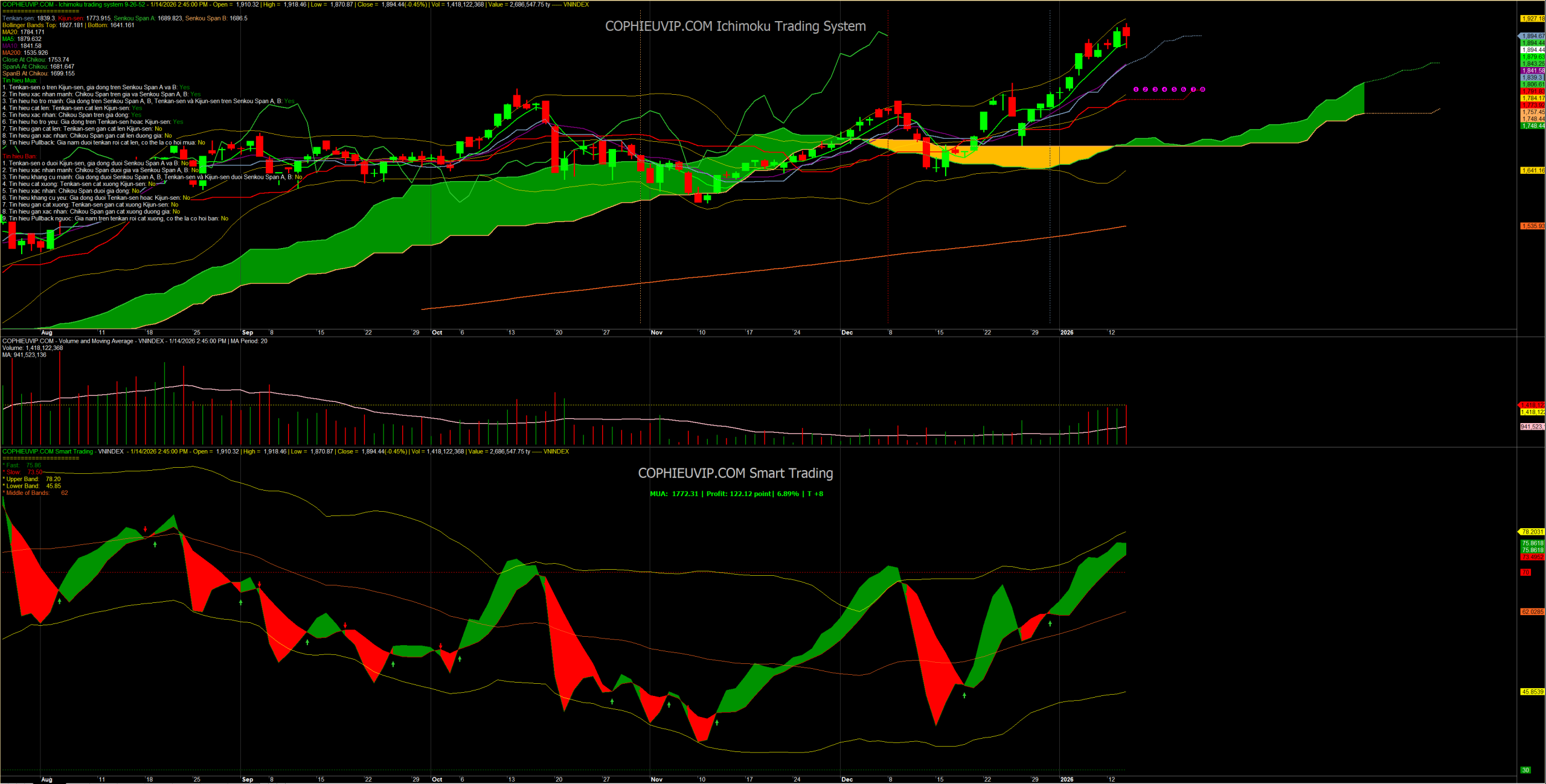 Về kỹ thuật và xung lực: VN-Index kết phiên 14/01 tại 1,894.44 điểm, đánh mất mốc tâm lý 1,900 dưới áp lực chốt lời “đỏ vỏ xanh lòng” điển hình. Đồ thị Daily cho thấy nến rút chân dài với khối lượng kỷ lục 1.33 tỷ cổ phiếu xác nhận lực cầu bắt đáy tại vùng 1,870 cực kỳ chủ động. Chỉ báo Smart Trading duy trì vị thế Mua (T+8) với lãi +6.89%, chưa có phân kỳ âm nhưng đang ở vùng Quá mua, báo hiệu sự cần thiết của các nhịp rung lắc tích lũy.