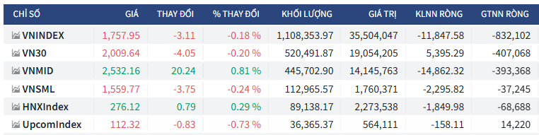 - Chốt phiên, VN-Index giảm 3,11 điểm (-0,18%) xuống 1.757,95 điểm; HNX-Index tăng 0,79 điểm (+0,29%) lên 276,12 điểm ; UPCoM-Index giảm 0,83 điểm (-0,73%) xuống 112,32 điểm