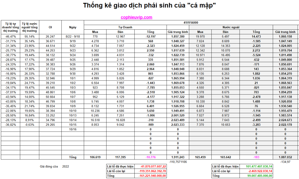 Kết luận sơ bộ: Thị trường phái sinh đang phát ra Tín hiệu Cảnh báo Rủi ro Điều chỉnh trước ngày đáo hạn (16/10). Sự đồng thuận Short ròng của cả Tự doanh và Khối ngoại, đặc biệt là Khối ngoại Short ròng ở mức cao nhất gần đây, cho thấy dòng tiền lớn đang gia tăng vị thế phòng vệ cho danh mục cơ sở đang ở vùng quá mua.