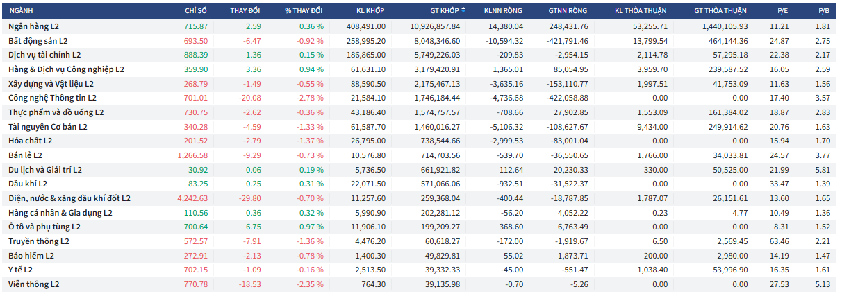 - Bất động sản: Giảm nhẹ -0.92% với thanh khoản cao thứ hai (8,048 tỷ VND).
