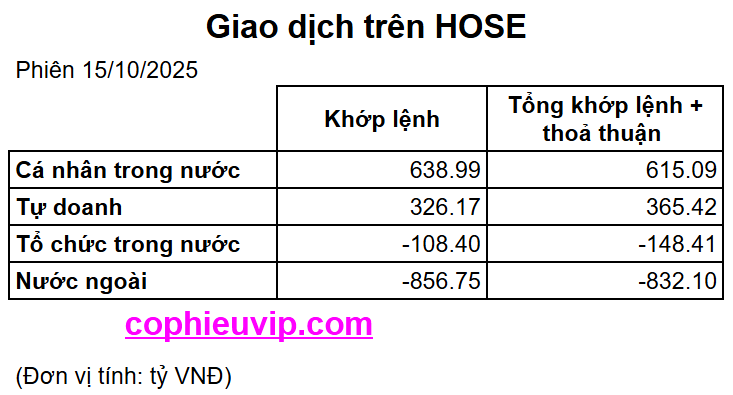 - Cá nhân trong nước: Mua ròng mạnh nhất thị trường, với giá trị +638.99 tỷ VND (khớp lệnh) và +615.09 tỷ VND (tổng hợp). Cá nhân tiếp tục là động lực chính của đà tăng.